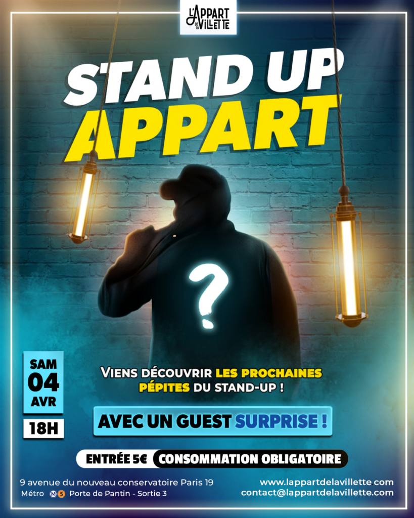 Nouveaux talents & guest mystère ✨🎤 Le samedi 4 avril à 18h, l’Appart de la Villette accueille une soirée stand-up pleine de surprises. Sur scène, une sélection de nouveaux talents …