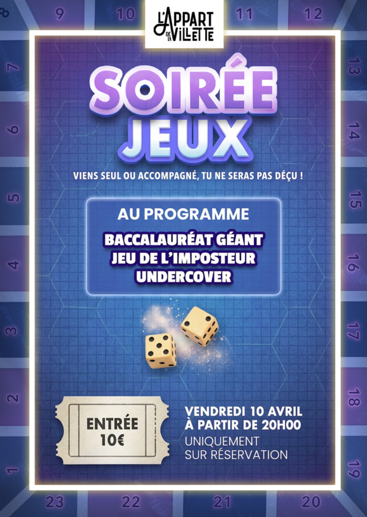 Le vendredi 10 avril à 20h, viens passer une soirée placée sous le signe du jeu, du rire et de la bonne humeur à l’Appart de la Villette.
